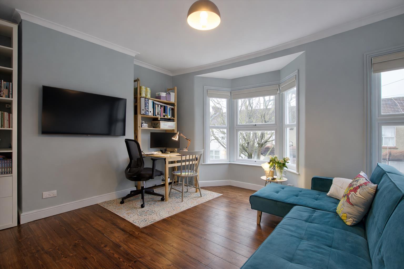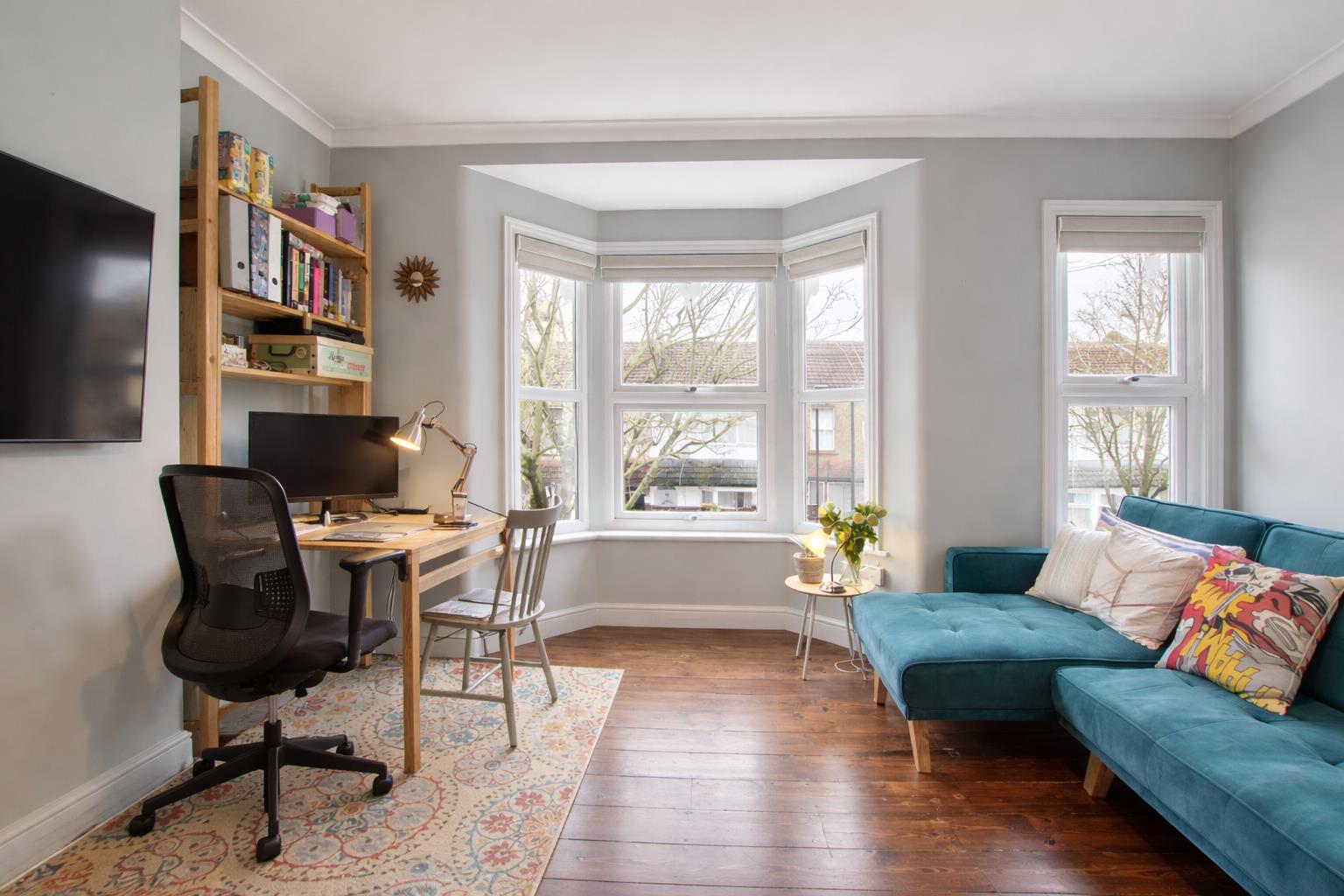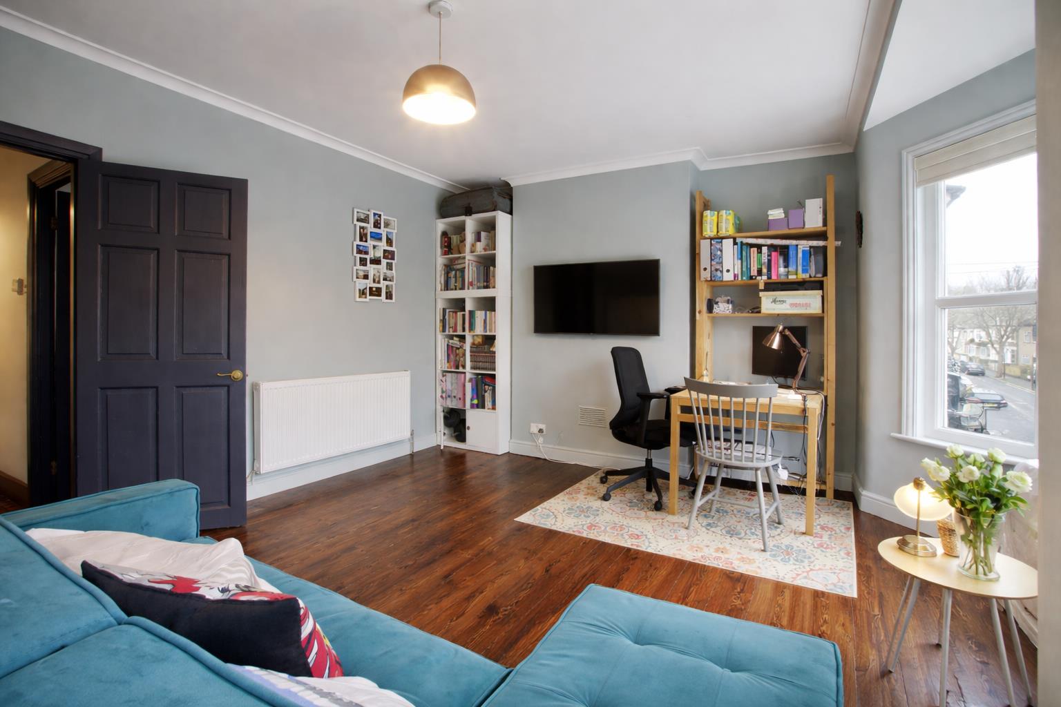 To the opposite side of the property, you will find a large and bright reception room featuring big windows, high ceilings, and stunning quality wooden flooring full of character. This space is perfect for relaxing and entertaining.